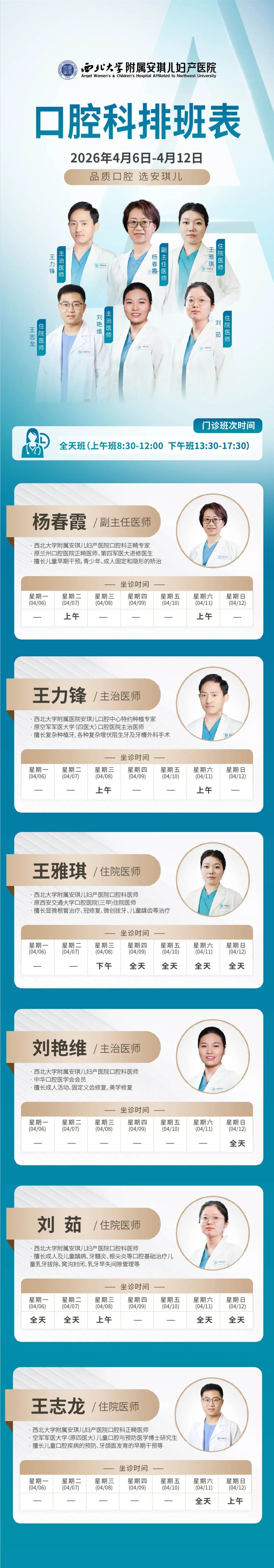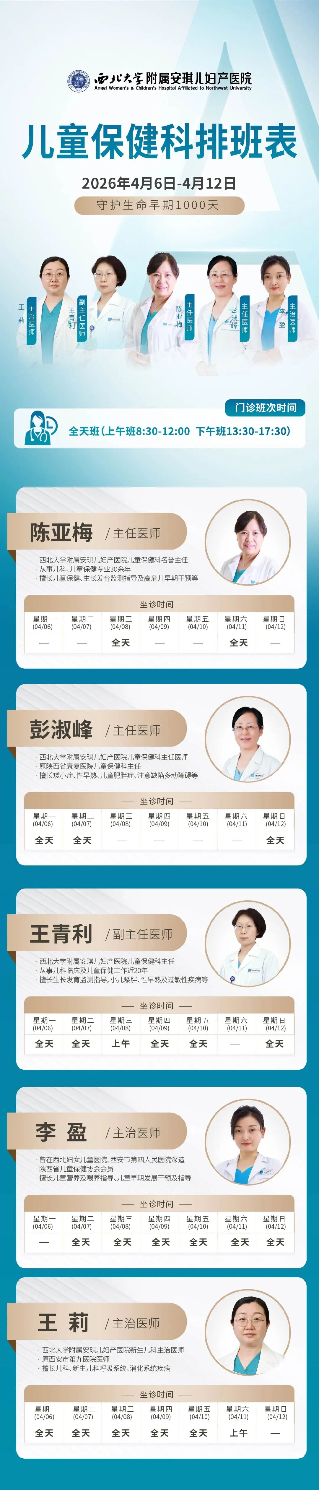 西安安琪儿妇产医院(4月6日至4月12日)专家坐诊时间表