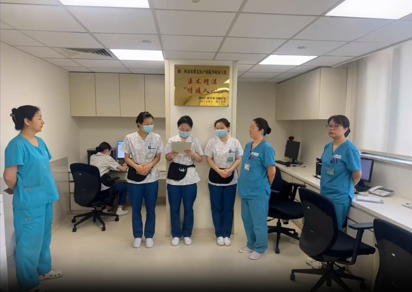 “Good morning everyone,Today is Mondy, August 20th,I'm a night nurse with five patients ......”,在妇科住院部医生办公室,护士用熟练的英语进行晨交班。