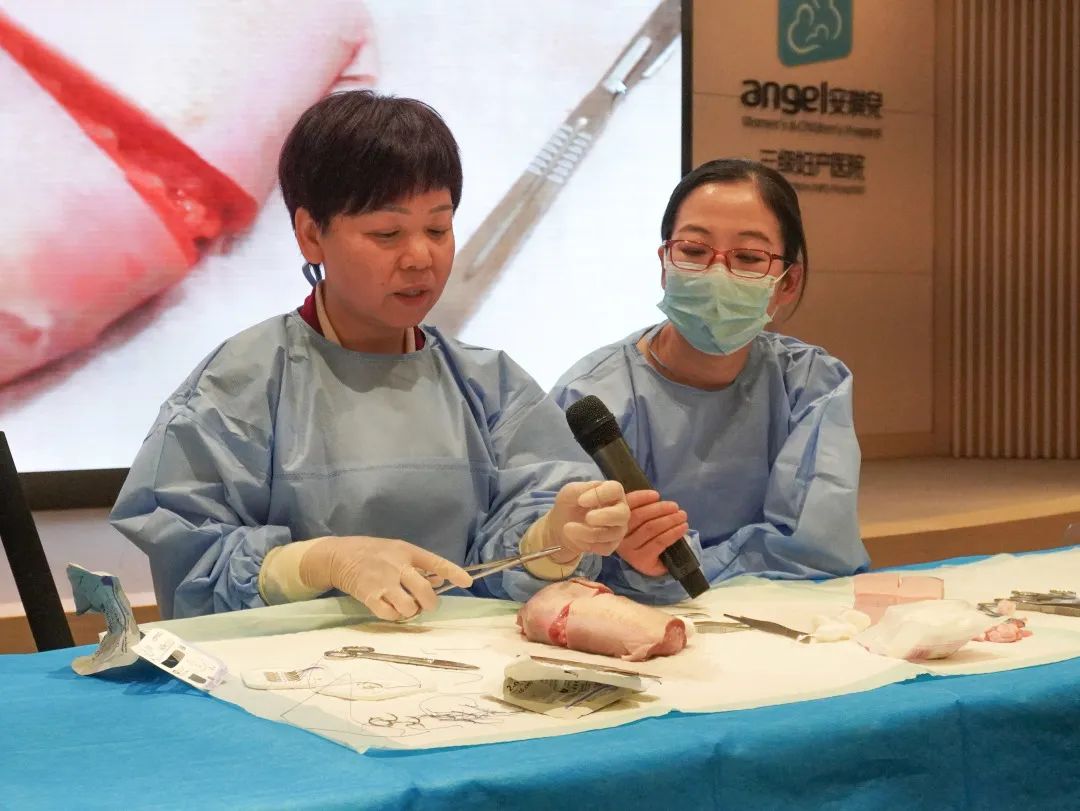 精彩授课之外,专家们采用教具通过阴道分娩及剖宫产伤口模拟制作到规范缝合演示,进行关于阴道分娩会阴裂伤缝合,会阴侧切缝合及剖宫产腹部伤口美容缝合的实际培训。