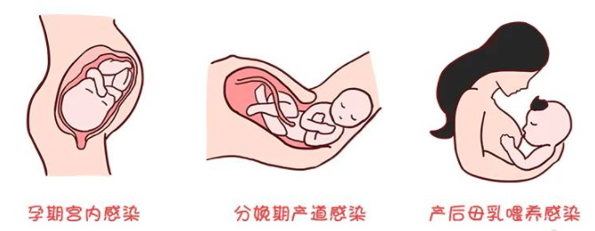 可通过胎盘,或产道(在分娩的过程中传播),也可通过哺乳传染。