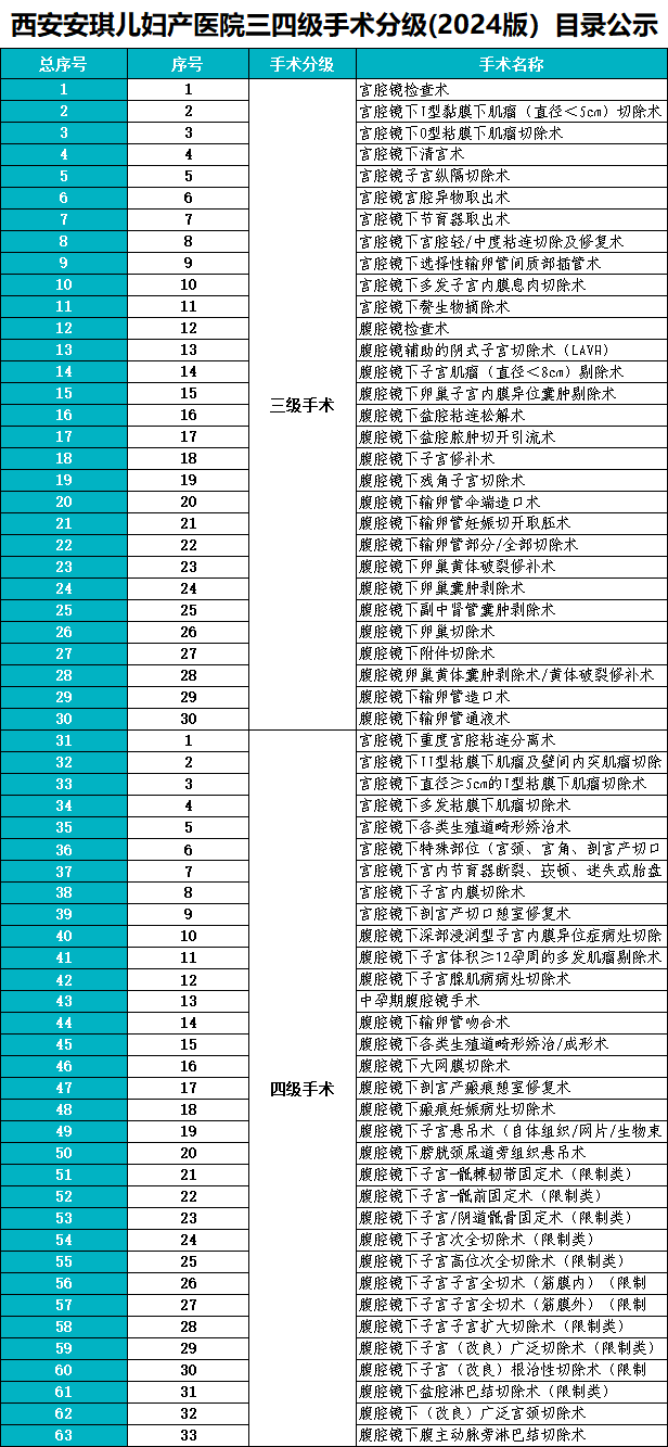 西安安琪儿妇产医院三四级手术分级(2024版)目录公示